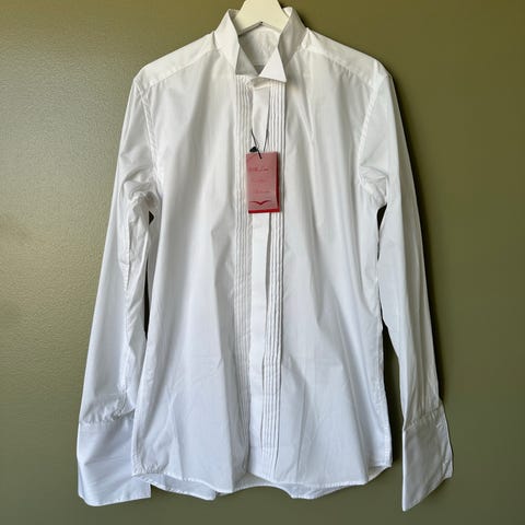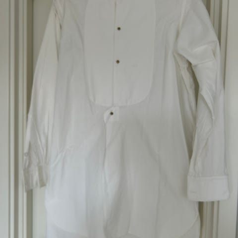 Frackskjorta med mjuk krage. Storlek L. Liten i storleken så den passar mig som har storlek M med 42cm i kragen. Använd fyra gånger. Nypris 800kr. Mindre hål på högerärmen som dock inte märks när man har på sig skjortan.
