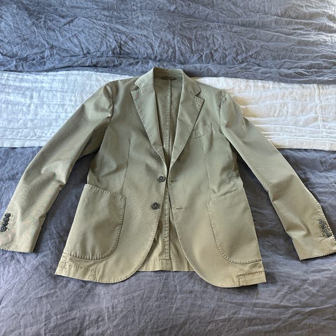 Kavajen har flera handgjorda detaljer, särskilt i kragen och slaget, vilket ger ett naturligt fall och en elegant drapering som bara blir bättre med tiden. Den är konstruerad med en canvasstruktur istället för sammanfogade material, vilket gör att plagget formar sig efter kroppen över tid och får en mer personlig passform. Ytterligare detaljer som handfästa knappar och noggrant utförd sömnad förstärker den klassiska skräddarsydda känslan. Axlarna är mjukt strukturerade för en elegant silhuett och det partiala fodret ger både komfort och flexibilitet.