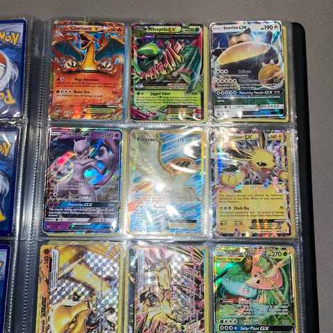 Pokémon samling spelkort med blandade motiv och typer. Flera kort med holo-/foil-effekt samt vanliga kort. Korten är sorterade i plastfickor i en pärm. Blandningen omfattar olika generationer och figurer, exempelvis el-, vatten-, psyke- och mörkerpokémon. Lämplig för samlare eller som utökning av befintlig kortlek i Pokémon Trading Card Game.
