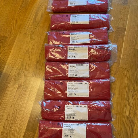 IKEA textilier. Fyra stycken textilprodukter i röd färg, förpackade i plast. Kan användas i hemmet, exempelvis som inredningsdetaljer eller praktiska textilier beroende på typ och storlek.