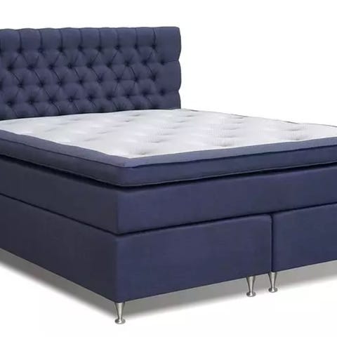 kontinentalsäng från Sängfabriken kontinentalsäng i mörkgrått tyg. Sängen består av två nedre resårbottnar med överliggande madrass och en hög, knapptad sänggavel. Ben i metall.