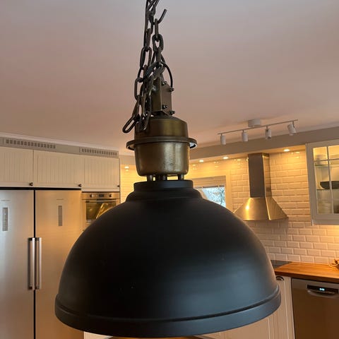 Lampan har en fin patina och den råa industrikänslan som gör den perfekt för både hem, café, stallinspirerad inredning eller industriell stil.