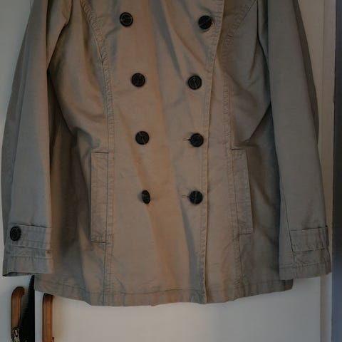 Snygg ESPRIT damjacka med fina detaljer. Rynkad i midjan. Huva under dragkedja i kragen. I mycket fint skick. Knappt använd. Strl 44/46. Längd ca 86. Finns på Umedalen. Swish.