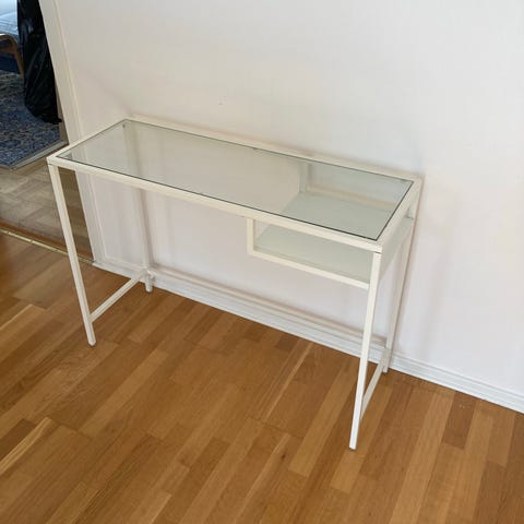 Säljer ett vitt skrivbord i metall med glasskiva, från IKEA. Är i ett fint skick och har inte kunnat hitta några skador eller repor. Mått 📏 Längd: 100 cm Djup: 36 cm Höjd: 74 cm