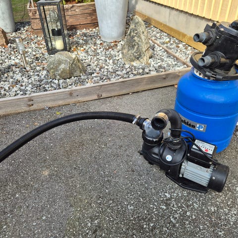 Pumpen är ca fem år gammal men har bara gått två säsonger. Extra axeltätning medföljer. Sitter monterad på en bit tryckimpregnerad regel för att stå stabilt, enkelt att plocka bort om så önskas.