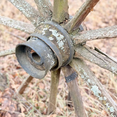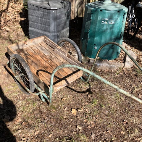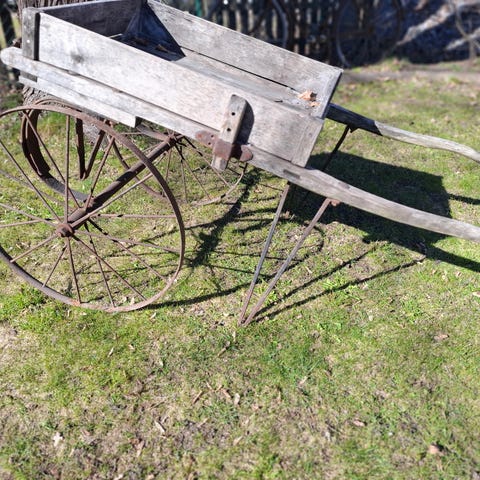 Hästdragen trävagn med järnchassi och trähjul