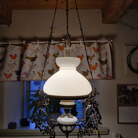 IKEA taklampa i klassisk stil. Lampan hängs upp med kedjor i taket och har en vit skärm i glas (Ej orginal) samt mässingsfärgad stomme och detaljer. Modellen är utformad som en äldre oljelampa med plats för elektrisk ljuskälla i mitten samt hållare för ljus runtom. Passar som belysning över matbord eller i vardagsrum där man önskar en mer traditionell inredningsstil.
