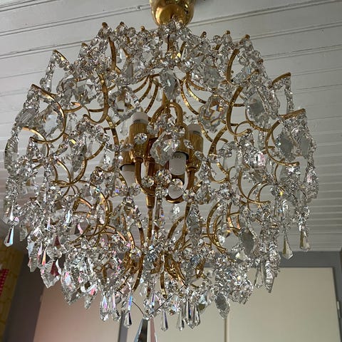 Trevlig mindre kristallkrona i guldfärgad metall.