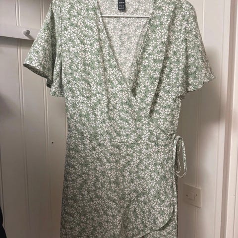 Shein sommarklänning för dam i storlek S. Klänningen är grön med småblommigt mönster och är tillverkad i polyester. Modellen är vadlång med omlottliv, korta ärmar och knytband i midjan. Passar som vardags- eller sommarklänning.