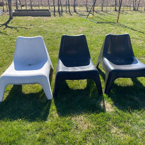 Thomas Sandell’s trädgårdsstolar Vågö i plast, från ikeas PS kollektion. Stolarna har låg sitthöjd och är utformade i ett stycke med lutande ryggstöd. Passar för utomhusbruk i trädgård, på altan eller uteplats.