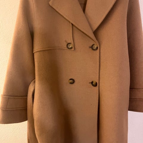 Zara kappa för dam i storlek S. Kappan är grå och tillverkad i ullmaterial. Modellen har krage, knäppning framtill och fickor i sidorna.
