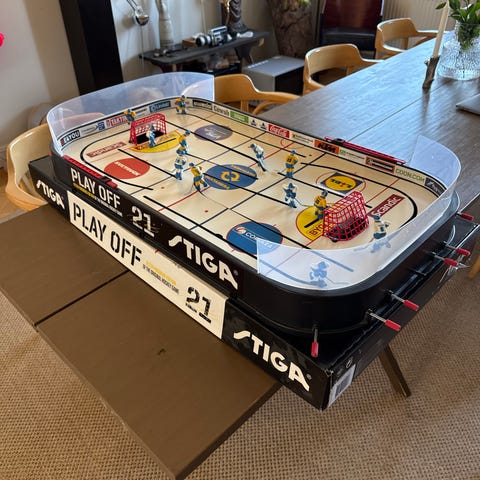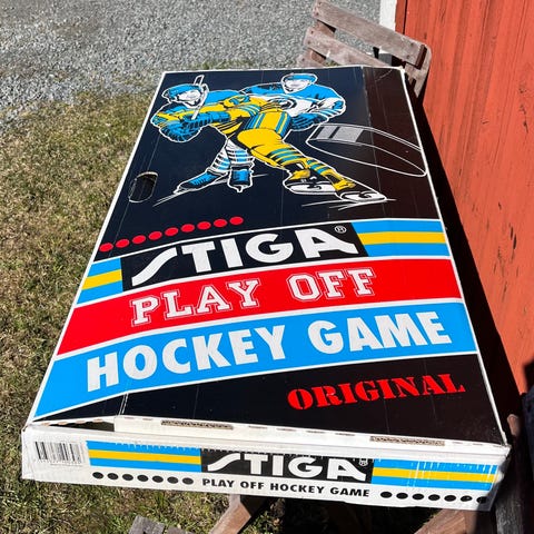 Stiga Play Off bordshockeyspel i röd och vit färg. Klassisk ishockeyplan med spelare monterade på stänger för manuell styrning av lagen. Spelplan med målburar, sarg och markeringar som efterliknar en riktig ishockeyrink. Levereras med originalkartong enligt bild. Passar för inomhusbruk på bord eller golv och kan användas av både barn och vuxna.