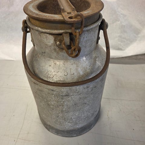 Gammal och rostig mjölkakanna av den mindre modellen, fräck detalj i trädgården för den kreativa..
