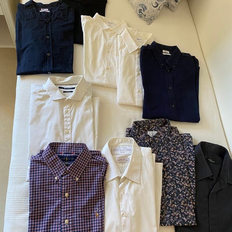 Fem pikétröjor från Pier One. En svart, en mörkblå, en vit, en vinröd och en mörkblå med mönster och grå krage. Alla tröjor har krage och knappar framtill.