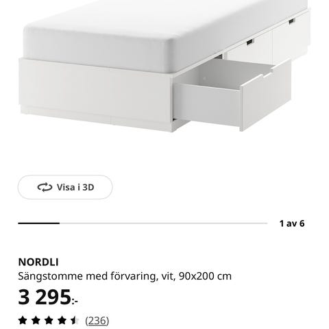 IKEA Nordli sängstomme 120x200cm med förvaring i vit färg. Ribbotten i trä och tre utdragslådor. Madrass från Ikea i modellen Hövåg ingår. I fint begagnat skick, inköpt för ca 6 år sedan och har använts sporadiskt som gästsäng. Inga anmärkningar förutom märket på madrassen (se bild). Har alltid använts med bäddmadrass och madrasskydd. Sängstommen säljs fortfarande så googla gärna för specifikationer.