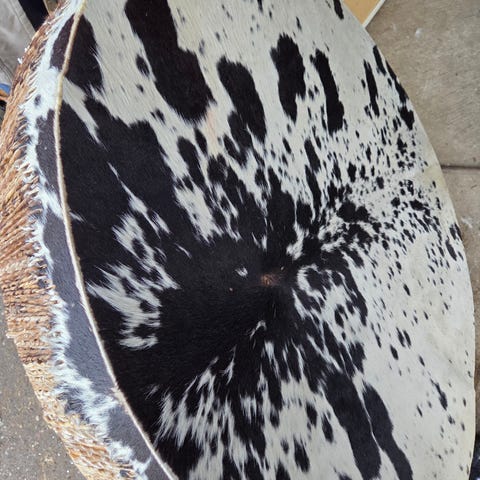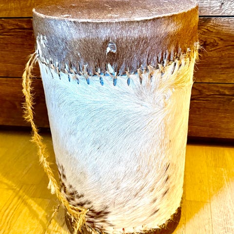 Handgjord trumma i trä och skinn i brun och naturfärgad ton - antik. Kroppen består av vertikala läderremsor runt en inre trästomme, och ovansidan har en mörkbrun spel-yta med ljusare kant. Runt kanten finns dekorerade symboler och stjärnor inristade i materialet. Membran 27 cm (x2) och höjden 37 cm. Se gärna min övriga annonser för fler trummor.