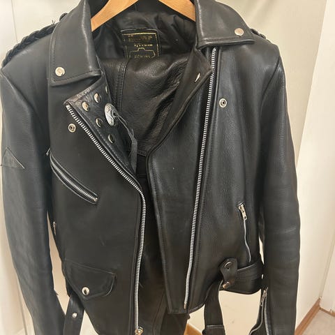Office mc-jacka och byxor i svart skinn. Jackan har dragkedja framtill, flera ytterfickor med dragkedja, axelparti med flätad detalj samt snörning i nederkant bak. Byxorna är i matchande svart skinn med bälte i midjan, hällor och fickor fram. Passar som komplett skinnställ för motorcykelkörning eller annan användning där ett kraftigare skinnplagg önskas.