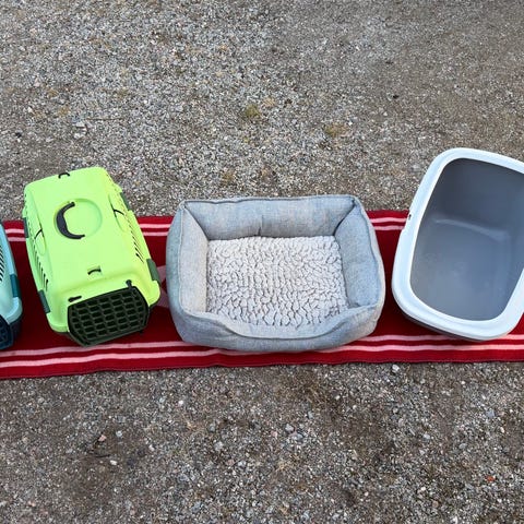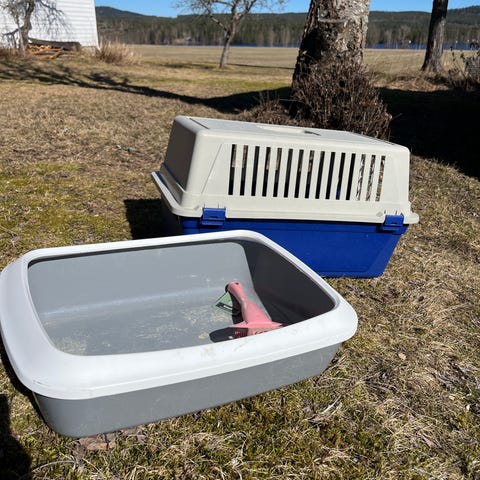 Transportbur och två kattlådor med tillbehör. I den ena lådan finns sandspade och leksaksbollar. I den andra lådan finns koppel och flexikoppel. Utrustningen kan användas för katt eller liten hund, till exempel för transport, rastning och inomhusbruk.