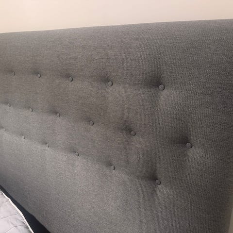 Mio sänggavel i beige textilklädsel. Gaveln har vadderad, rutquiltad framsida. Passar som huvudgavel bakom säng och kan användas i sovrum för att ge stöd och avgränsning mot vägg. 94x62 cm