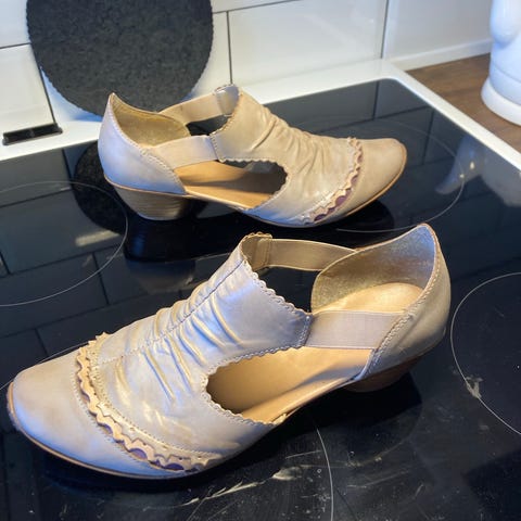 Rieker finskor för dam i storlek 38. Skorna är grå med dekorativa utskärningar och rynkad detalj framtill. Modellen har rem över vristen med knappdetalj och en låg klack i trälook. Öppen design vid sidorna ger luftig känsla, lämplig för vardag och enklare festliga tillfällen.