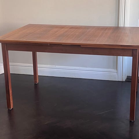 Stort matbord i teak från Danmark med två underliggande skivor i kanon skick, stabilt helt felfri, passar som matbord eller större arbetsbord i vardagsrummet, kök eller matsal, klassisk formgivning med raka linjer o runda ben som ger ett tidlöst uttryckt.
