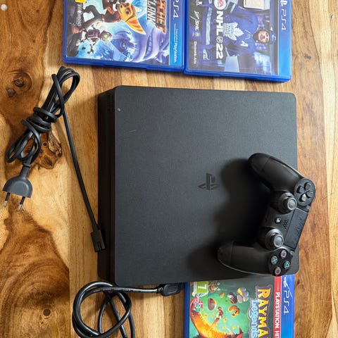 Ps4 slim med handkontroll. Funkar som den ska men kontrollen är ganska sliten. Jag kan skicka med strömsladd och hdmi sladd om de behövs.