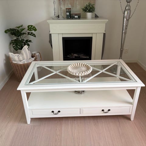 Säljer ett fint retro soffbord i trä med glasskiva. Bordet är i mycket bra skick, stabilt och välbevarat. Det har en praktisk hylla och lådor för förvaring, vilket gör det perfekt för vardagsrummet.
