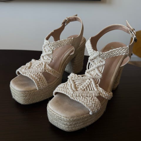 Belezza kilklackskor i storlek 39. Skorna har vit ovandel med virkade spetsdetaljer och öppen häl. Sulan är i flätad jute med kilklack.