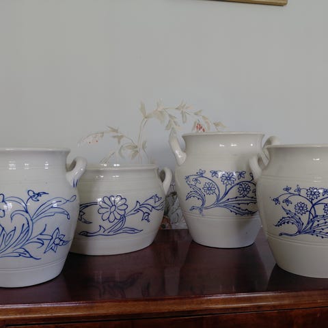 IKEA krukor i brun keramik med dekorativt mönster. Setet består av flera krukor i olika storlekar, lämpliga som dekoration eller för förvaring. Passar exempelvis i kök, vardagsrum eller på hylla som prydnad.