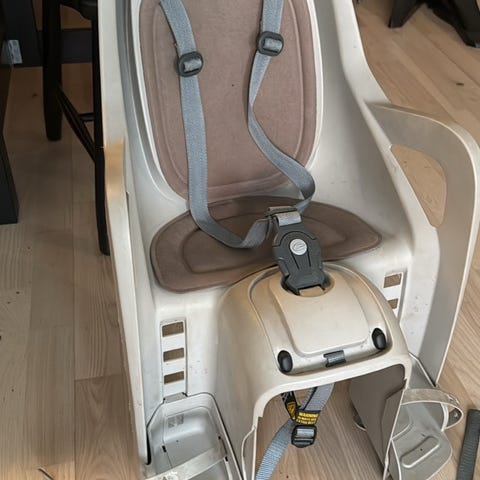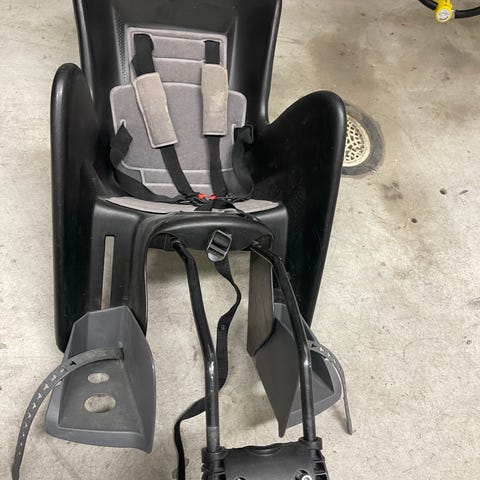 Barncykelstol, märkt med Polisport Boodie. Kan förmodligen inte sättas på cyklar med pakethållare. Gick inte på vår i alla fall.
