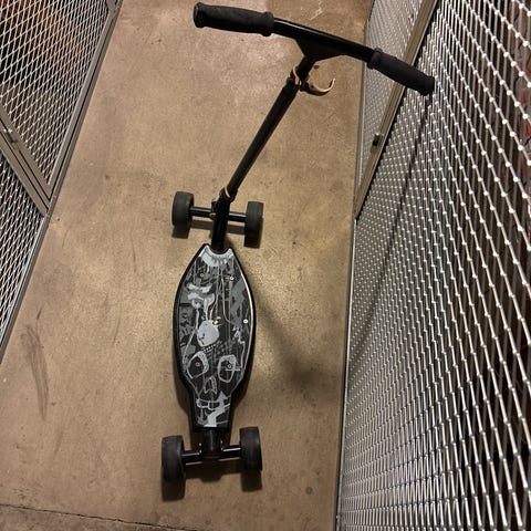 California Twister Tri-Wheeler waveboard i svart med vit mönstrad design. Brädan har två hjul monterade i svängbara truckar och en vridbar mittdel i metall. Över- och undersida har strukturerad yta för bättre fotfäste. Passar för åkning på plana, hårda underlag som asfalt eller betong.