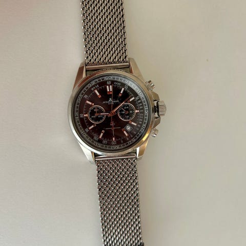 Klockan är helt ny. Har inte använt den. Dock ska du lägga egna batteri så den funkar. Vet inte vilken storlek den är. Den är en stainless steel.
