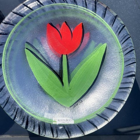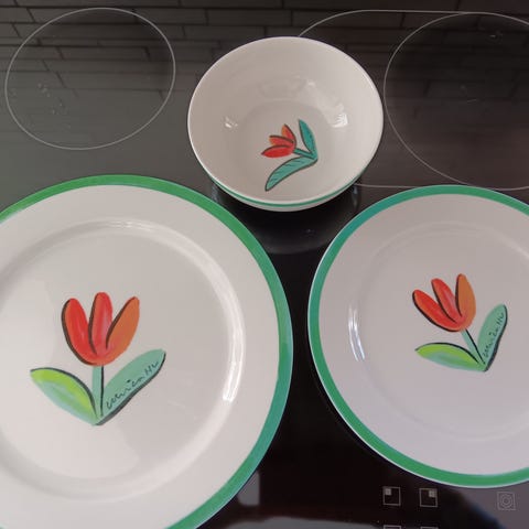 1. Kosta Boda Ulrica Hydman-Vallien ”Tulipa” porslinservis med tulpanmotiv. Servisen består av 6 tallrikar, 1 pajform och en glasskål.