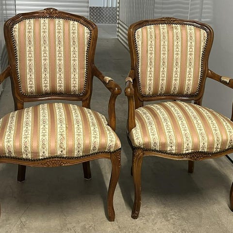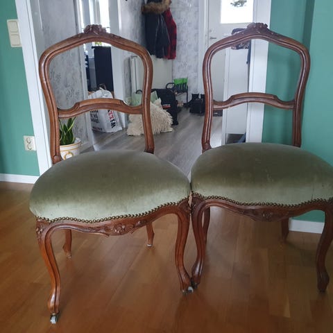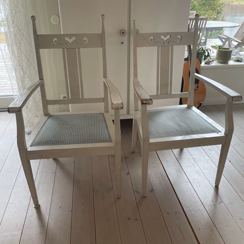 Karmstolar 2 st gedigna och bekväma. Mått: H 100 cm sits 46 cm B 60 cm _Inga fläckar,liten rivmärke av katt finns på sitsen,annars i perfekt skick,ej nersuttna eller smutsiga.