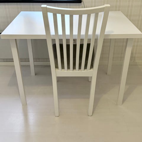Mio stol i vitmålat trä. Klassisk modell med rak sits och ryggstöd med ribbor och kryssdetalj upptill. Passar till matbord eller som extra stol i kök, vardagsrum eller hall.
