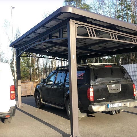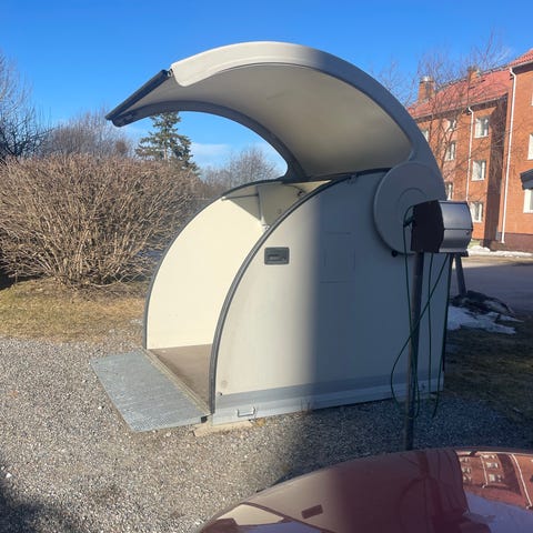 Förvaringsgarage för elrullstol och permobil med elektriskt uppfällbart tak. Garaget är avsett för utomhusbruk och ger väderskydd för elrullstol, permobil eller rollator. Invändigt finns eluttag och kabeldragning för laddning, belysning samt hyll- och korgsystem för tillbehör. Ramp framtill underlättar in- och utkörning. Utsidan är märkt med handikappsymbol. Passar placering intill husvägg eller på gård där skyddad förvaring och laddning av hjälpmedel behövs.