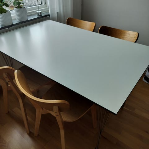 Säljer ett modernt matbord med vit bordsskiva och silvriga metallben. Enkelt och stilrent, passar i de flesta hem. Perfekt storlek för 4+ personer.