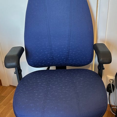 Kontorsstol från Håg modell H05 med Swingback-armstöd. Tyget kan behöva en lätt rengöring men annars gott skick. Höj- och sänkbar sits, nackstöd justerbart i höjd och djup, sits justerbar i djup, plus ett par andra reglage med för mig okänd funktion.