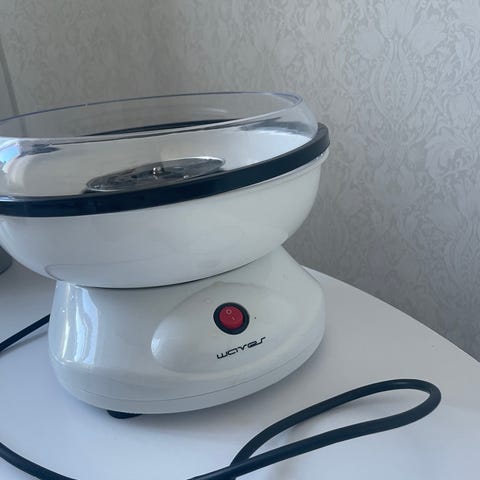 Candyfloss King sockervaddsmaskin på vagn i rosa utförande. Maskinen står på en mobil vagn med två stora hjul och handtag för enkel förflyttning. Skålen är i metall med genomskinlig kupol ovanpå som skydd vid användning. På sidan finns kontrollpanel med strömbrytare och reglage. Till maskinen hör en kartong med pappersstrutar för servering av sockervadd och ca 7kg socker.Lämplig för användning vid evenemang, kalas och liknande.
