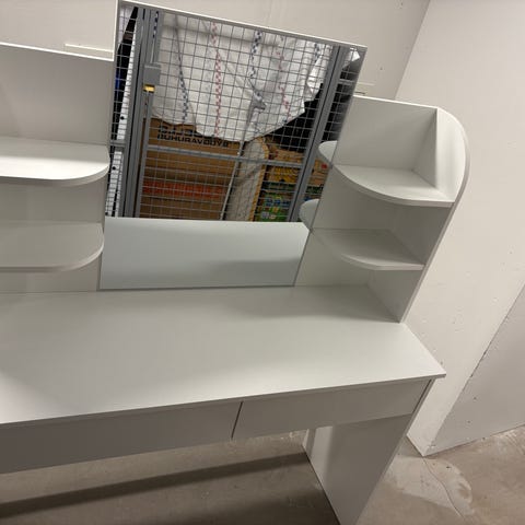 Sminkbord med spegel i brun träfinish. Möbeln har två sidomoduler med sex lådor för förvaring och en fristående spegel med dekorativ ram placerad ovanpå bordsskivan. Passar som toalettbord eller skrivbordsliknande förvaringsmöbel i sovrum eller hall. Sits/pall ingår enligt bild.