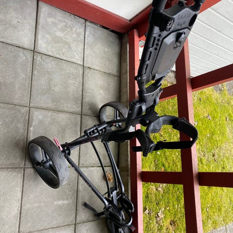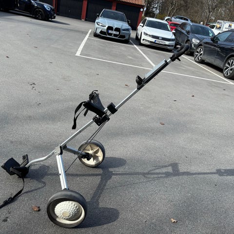 Europa golfvagn i svart utförande. Vagnen har tre hjul med korg och paraplyhållare. Går ej att fälla ihop