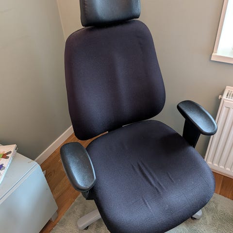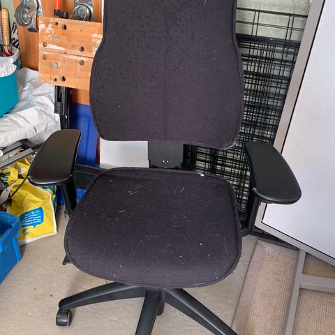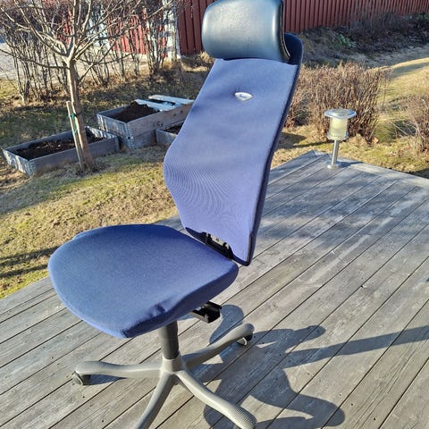 Blå gamingstol bortskänkes mot avhämtning, dammig och slitna/trasiga armstöd. Hiss finns.