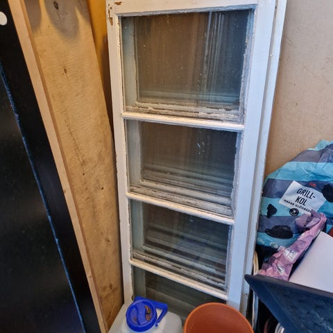 Äldre träfönster, vitmålad karm och spegelglas istället för fönster. Lite slitage. Mått: ca 93-94 cm hög