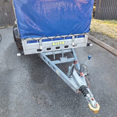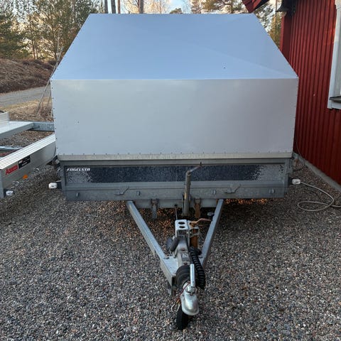 Kåpsläp från Böckmann. Släpet besiktigades nyligen den 10.04.2026. Enligt besiktningsmannen är släpet i mycket gott skick.