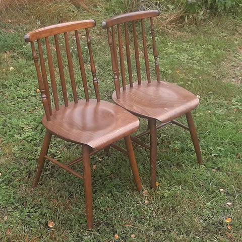 Bordet har skador framförallt på skivan som syns på bilderna. Den svarta fläcken är det enda som inte är ytligt. En av stolarna har en skada på sitsen som skulle behöva åtgärdas, annars är allt i gott och användbart skick.