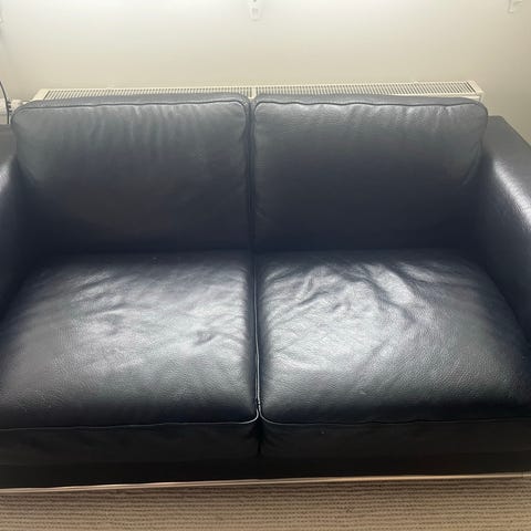 Lädersoffa i populär stil. Jag är andra ägaren och den ska tydligen vara från samma fabrik som andra kända modeller, men jag har ingen garanti på det. Det jag kan säga är att t. ex. detaljer som svetsskarvar ser toppen ut så det är en välgjord kopia. Rök- och djurfritt hem. 180 cm bred, 70 cm djup. 67 cm höjd.