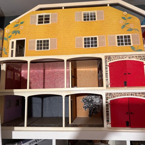 Dockhus i trä i rosa färg med flera våningar och rum. Huset har detaljerad fasad med fönster och dörrar samt öppningsbar baksida för lek på insidan. Passar för lek med mindre dockor och figurer och kan möbleras med dockhusmöbler efter behov.