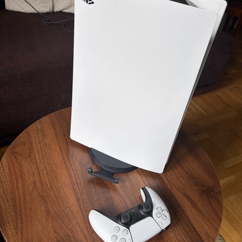 Playstation 5 med två kontroller och ladd stativ kontrollerna. Även ps5:an stå på ett tillbehör som köptes.