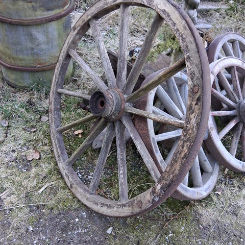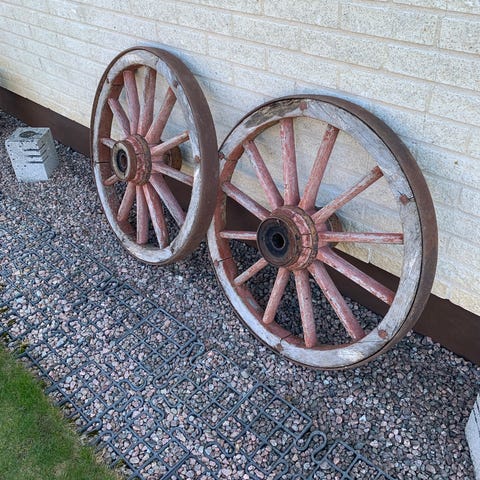 Vagnshjul i Ek 85 cm. I bra skick med järn runt Pris 2 x 500:-