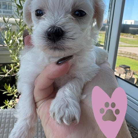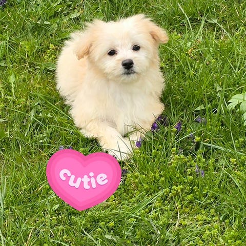 Mamma är vår egen vita Maltipoo med ett lugnt och kärleksfullt temperament. Hon väger 3.8 kg.